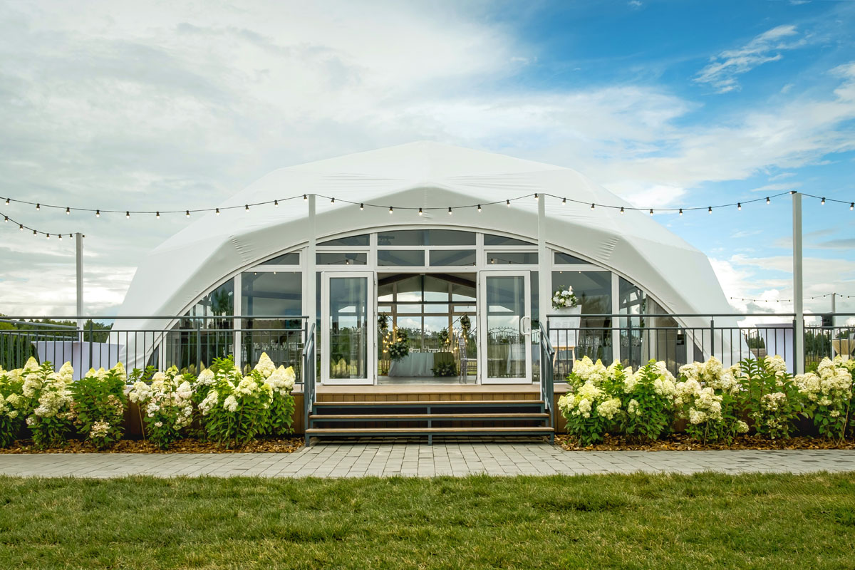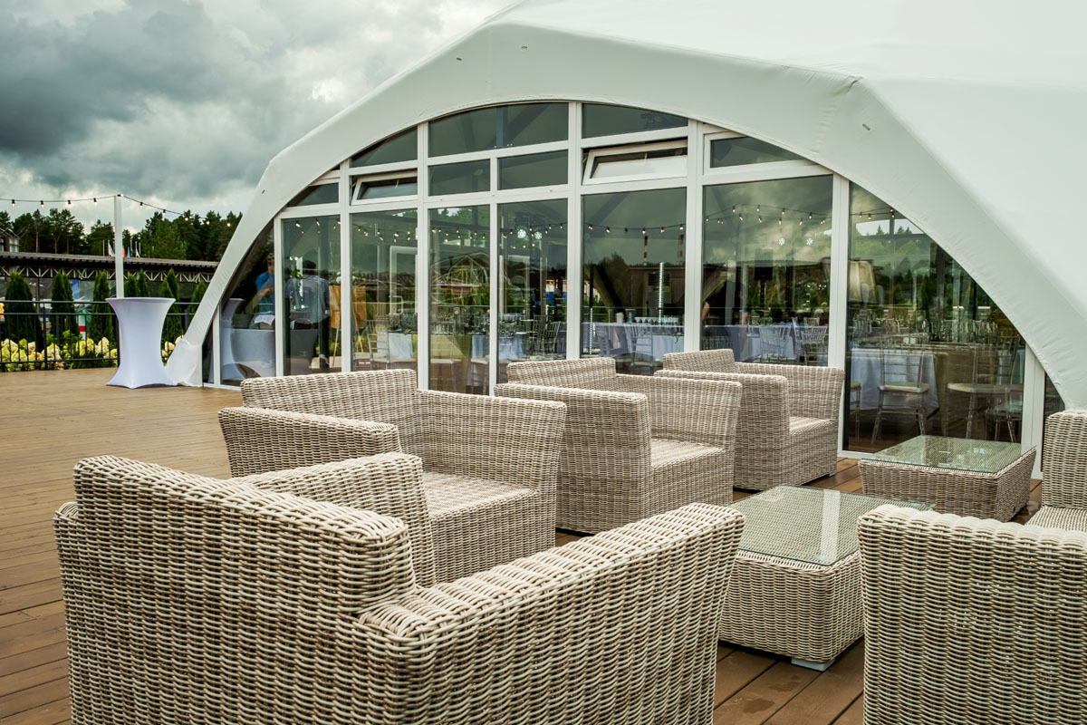 Круглогодичный шатёр площадью 144 кв.м станет идеальным местом для проведения свадеб и других значимых событий. Просторный зал с панорамными окнами открывает восхитительный вид на зелёный луг и величественный лес. Шатёр окружён живописными туями, создающими атмосферу уединённого комфорта. Веранда с уютной зоной отдыха и площадки для выездной регистрации на траве добавляют особое очарование этому месту. Внутри предусмотрены все удобства: кондиционеры для комфортной атмосферы в любое время года, гримёрная комната и современные уборные. Этот шатёр способен вместить до 70 гостей и идеально подходит как для романтических свадеб, так и для деловых мероприятий, сочетая в себе элегантность и природную красоту.