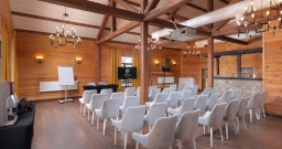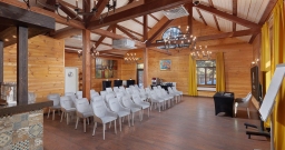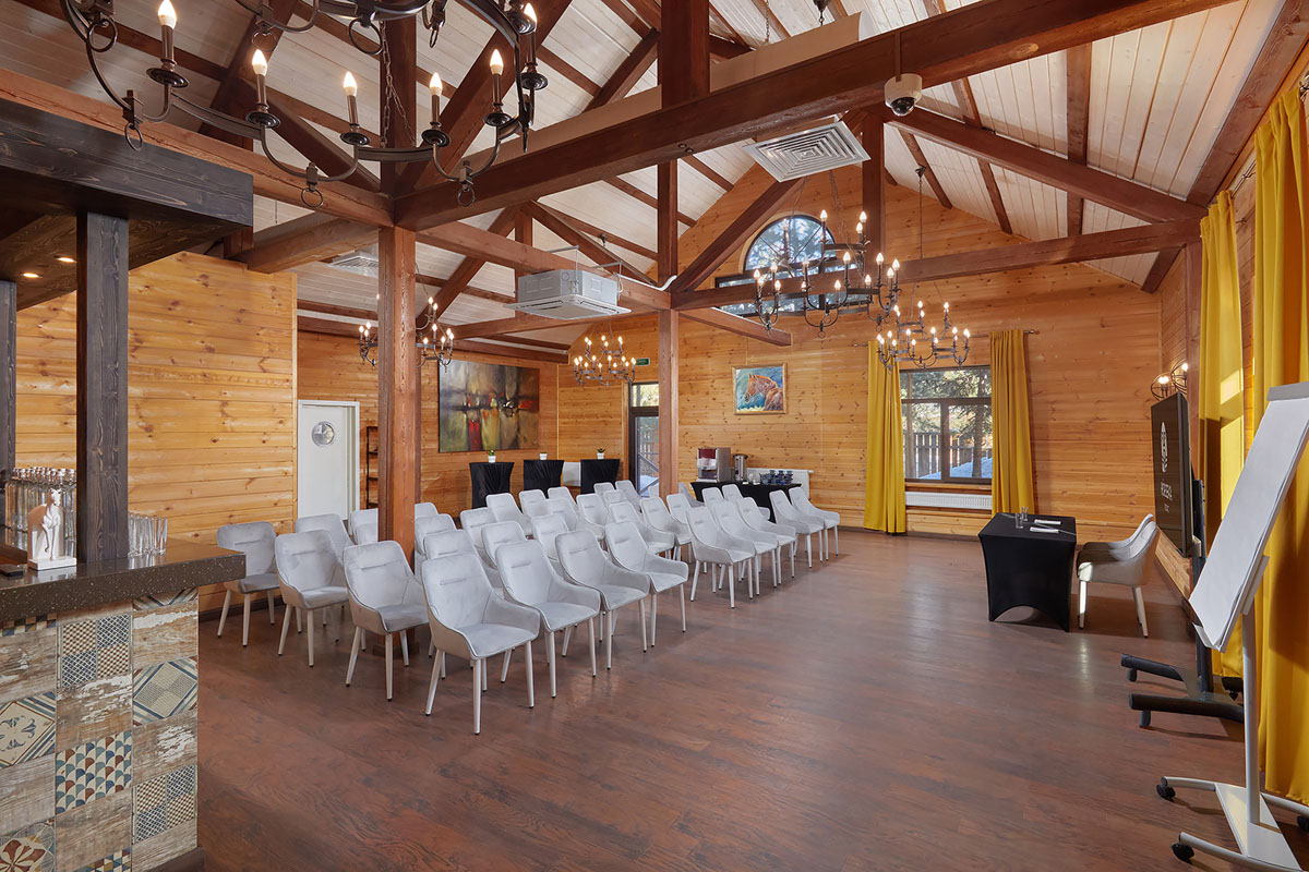 Стильный и уютный зал, выполненный из натуральных материалов, придает природную и теплую атмосферу вашей конференции или семейному торжеству. Вместимость зала до 90 гостей делает его отличным выбором для небольших и средних компаний.