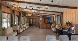 Уютный и лаконичный банкетный зал, идеальное место для тех, кто ценит комфорт и уединение. Теплая и приглушенная отделка создает атмосферу уюта, а панорамные окна открывают великолепный вид на территорию.. Это идеальное место для проведения корпоративного мероприятия или семейного торжества в уютной обстановке, где можно насладиться природной красотой и волшебной атмосферой. Вместимость до 100 гостей, идеально для небольших и средних групп.